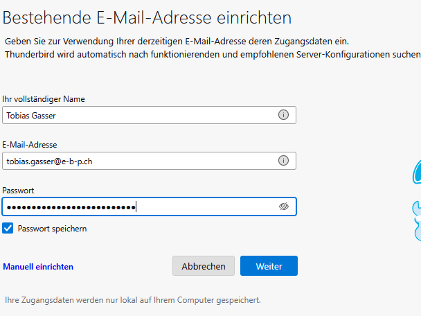| Thunderbird erkennt die notwendigen Daten automatisch weitgehende korrekt.